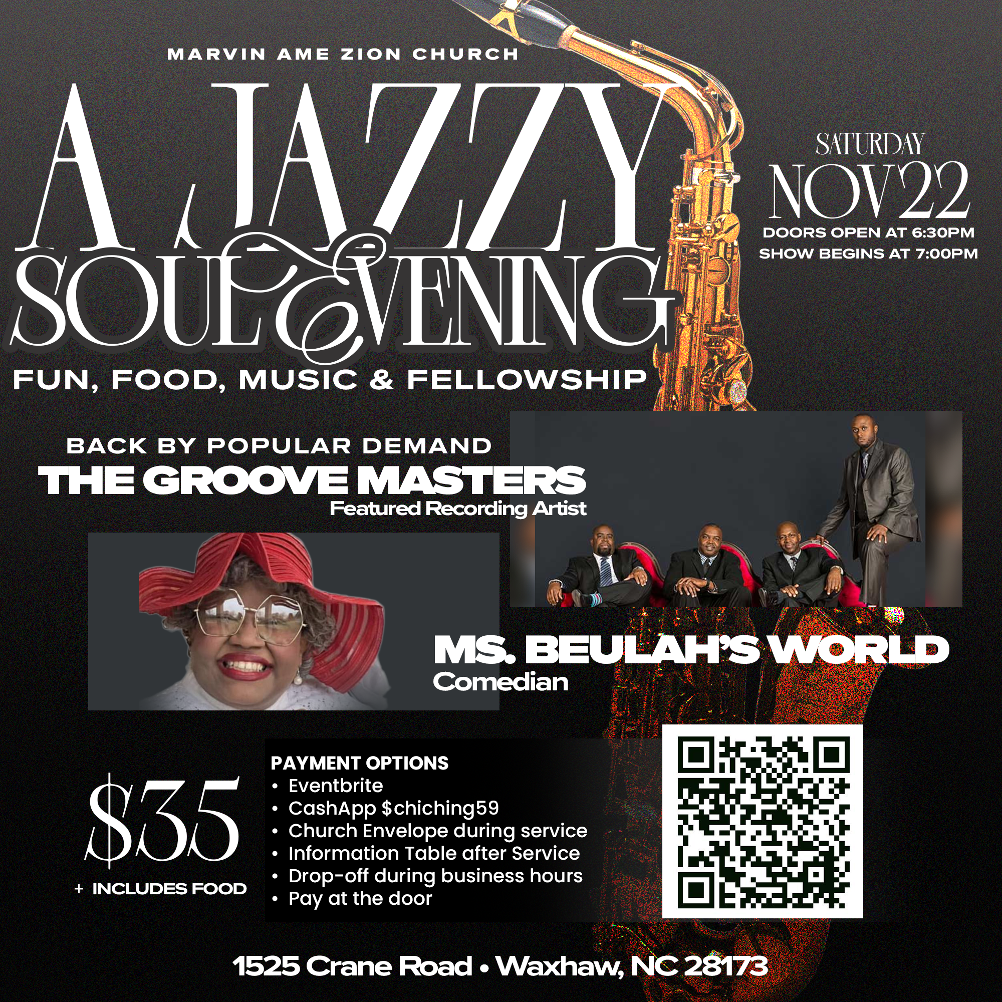 Register by midnight on Saturday, November 15 for a chance to win a pair of tickets to A Jazzy Soul Evening featuring The Groove Masters at Marvin AME Zion Church in Waxhaw, NC on Saturday, November 22. Winners will be notified via email on Monday, November 17th.